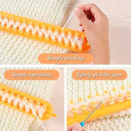 Használat:A Knitewise használatához helyezze a kötőfonalat az eszközre és kössön csomót. Ezután tekerje a gyapjút a készülék köré. Használja az eltávolító kampót, hogy segítsen eltávolítani a kötött darabot a tartozékról.